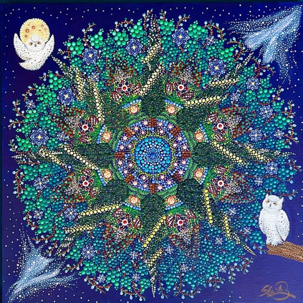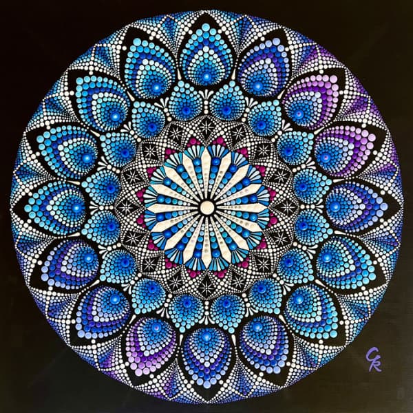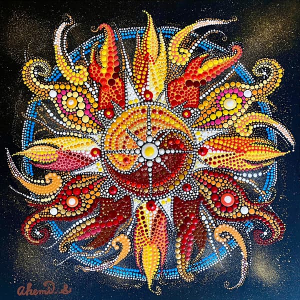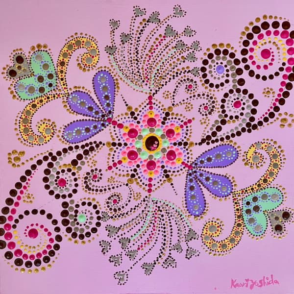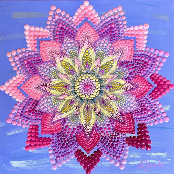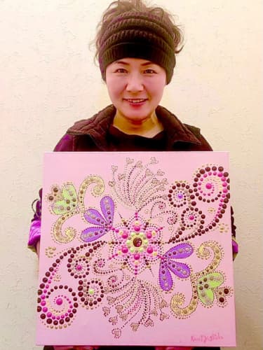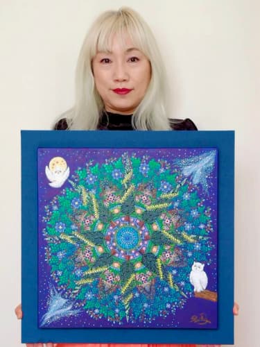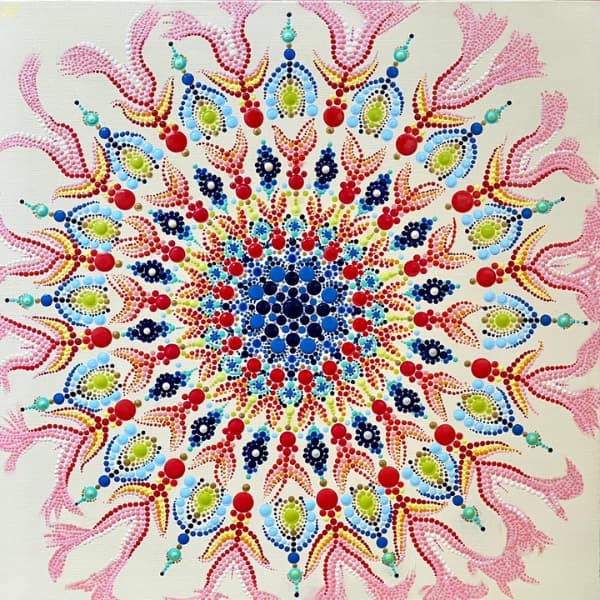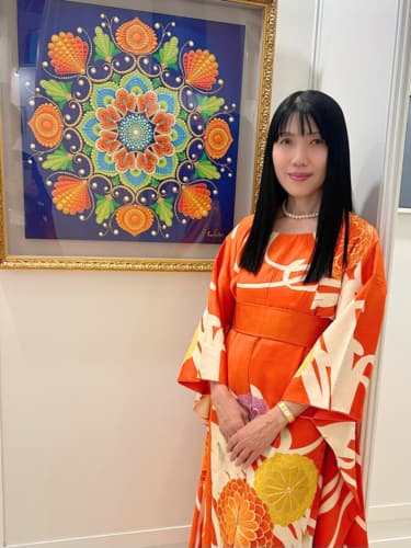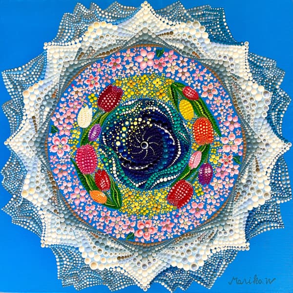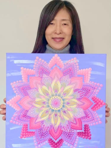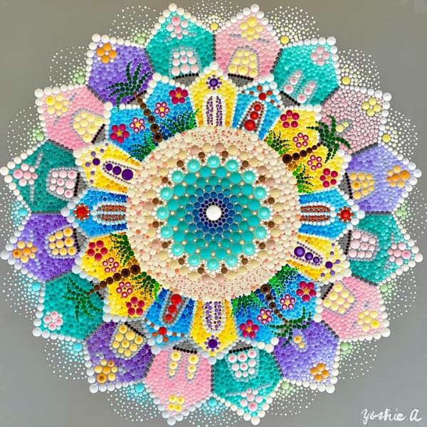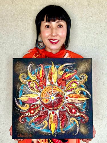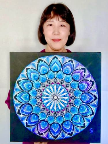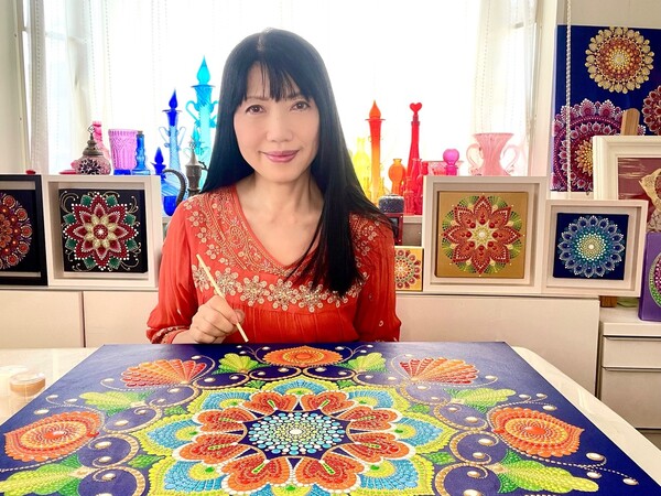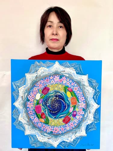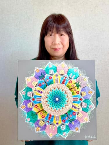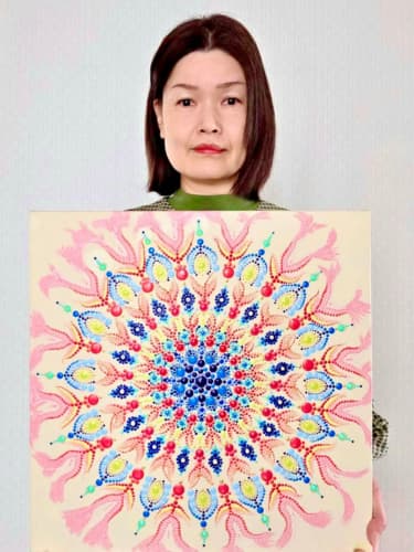 国立新美術館アンデパンダン展 2026年3月18日~3月30日 過去の出展作品はこちら 過去の出展作品はこちら ハッピーカラーマンダラ展覧会作品紹介 受講生は全く初めてでも 1年でオリジナル作品を描きました 絵は、中学の授業以来描いたことないし・・・絵心もないし・・そんな方でも、瞑想マンダラアートなら、今までにないオリジナルの手法により、絵心に関係なく、誰でも簡単に美しいマンダラアートが描けます。さらに、自分と向き合うことで望む未来について考えて、自分の人生を表現するオリジナルのマンダラを描き上げることができます。 カリブのひととき ここに生きる きらめき ダリアの光 循環 ある日の森 私の中の太陽 ワンチャン カリブのひととき ここに生きる きらめき ダリアの光 循環 ある日の森 私の中の太陽 ワンチャン 作品名 カリブのひととき 30年ほど前に訪れたカリブ海の国バハマ。滞在中、セスナで日帰りしたエルーセラ島とハーバーアイランドを思い出しながら描きました。当時の写真やGoogle Mapsで記憶を辿りながら、もう一度旅をしているようでした。 浅岡 淑江 マンダラレッスンの感想 3年前、絵を描いた経験がないけれど出来るかな?と思いながら受講を始めました。気づけば、3回目の日本アンデパンダン展出展まで来ることが出来ました。地方在住の私にとって、東京の展覧会に出展することは信じられないことでしたが、今年はニューヨーク公募展にも出展し、現地参加まで経験しました。1年前には想像もしていなかったことです。講座はオンラインレッスンですが、先生や受講生と定期的に画面越しで顔を合わせているため、距離を感じることなく楽しく受講しています。今回の作品は、30年ほど前に訪れたカリブ海の島での楽しかった記憶を思い出しながら描きました。普段は慎重な性格でなかなか点を打てないのですが、今回は浮かんだ気持ちをそのまま、勢いで描いてみました。この変化は、ニューヨークで見たものや感じたことの影響もあると感じています。今年の秋には、受講生仲間と銀座でグループ展を開催します。会社勤めをしながら制作時間を確保するのはとても大変ですが、多くの方に観ていただけるよう頑張りたいと思います。来年の今頃、また、1年前には想像もしなかったどんなミラクルが起きているのだろう、と考えるとワクワクします。 作品名 ここに生きる 雪解けの山、芽吹く花、そして身近に広がる海。富山県の春の景色と自然の循環を表現しました。大好きなこの地で、自然に支えられながらこれからも生きていく想いを込めて 渡辺 万里子 マンダラレッスンの感想 これまで絵を描いた経験は全くありませんでしたが、曼荼羅を描き始めて気づけば2年が経ちました。最初は無心にドットを打つだけでしたが、回を重ねるごとに表現の奥深さに魅了されています。オンラインレッスンでは、画面越しであっても先生が常に分かりやすく丁寧に指導してくださり、その細やかな技術をしっかりと習得することができました。また、カラーセッションを通じて自分の内面を色に置き換える経験は、理論だけでは辿り着けない「心の整理」にも繋がり、自宅にいながら深い学びを得られています。曼荼羅を始めてから、日常の景色の見え方が劇的に変わりました。道端に咲く花の色や海面に反射する光など、これまで見過ごしていた美しさに足が止まるようになったのです。それは自分自身の心に対しても同じで、制作を通して一粒ずつドットを打つ時間は、自分を肯定し、穏やかさを取り戻す大切な儀式のようになりました。今回、2回目となる展覧会への出展にあたり、自分の住んでいる身近にある景色をテーマにオリジナル作品を完成させました。テクニック面での進化はもちろんですが、何より納得いくまで自分と向き合い、「しっくりくるまで諦めない」という自分への信頼が深まったことが大きな収穫です。未経験から始めた私が、こうして再び大きな舞台に立てた喜びを、ぜひ多くの方に知っていただきたいです。曼荼羅は、自分を再発見させてくれる最高のツールです。心が動くままに色を置く楽しさを、ぜひ一人でも多くの方に体験してほしいと願っています。 作品名 きらめき 切子のグラスを覗いた瞬間に灯る感情を「きらめき」として表現しました。点を打ち重ねてゆくと心は凪のように穏やかになり、グラスの内に秘めたまばゆい光が、自身の内面と響き合い広がっていく様を描きました。 北澤 智佳子 マンダラレッスンの感想 子どもの頃から色に強い関心があり、絵を描くことが好きでしたが、自分は下手だと思っていました。そんな私が出会ったのがハッピーカラーマンダラです。絵に自信がなくても、色が好きで、ものづくりが得意な私にとって、しっくりくる表現方法だと感じました。オンラインレッスンではドットの打ち方や配色のコツを学び、わからないことや迷ったときには丁寧なアドバイスをいただきながら一つひとつ形にして